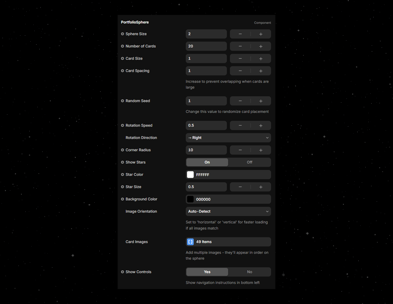 Simply copy and paste the component into your Framer project.Connect your image assets using the Card Images array and watch them arrange themselves around a 3D rotating sphere.Customize properties like rotation speed, sphere size, starfield density, and card spacing from the right-hand panel to create your ideal motion aesthetic.