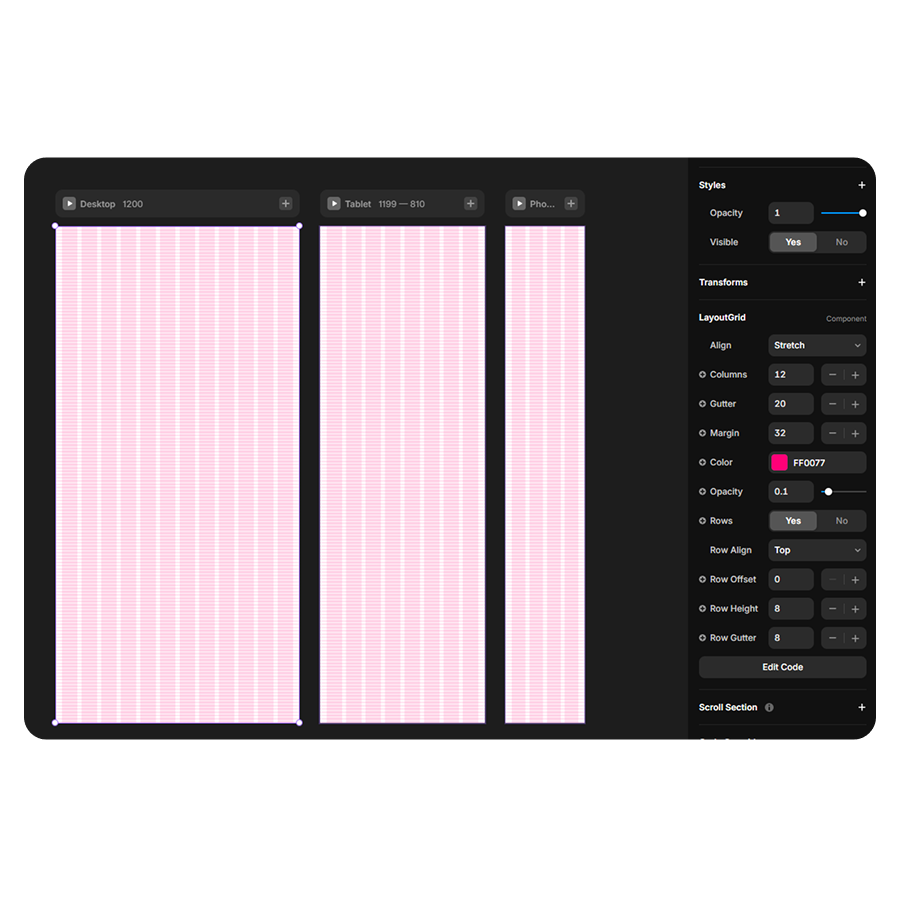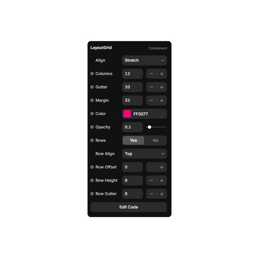 Bring a Figma-like, fully customizable grid system directly into your Framer projects. This component has a non-interactive overlay (with both columns and rows).