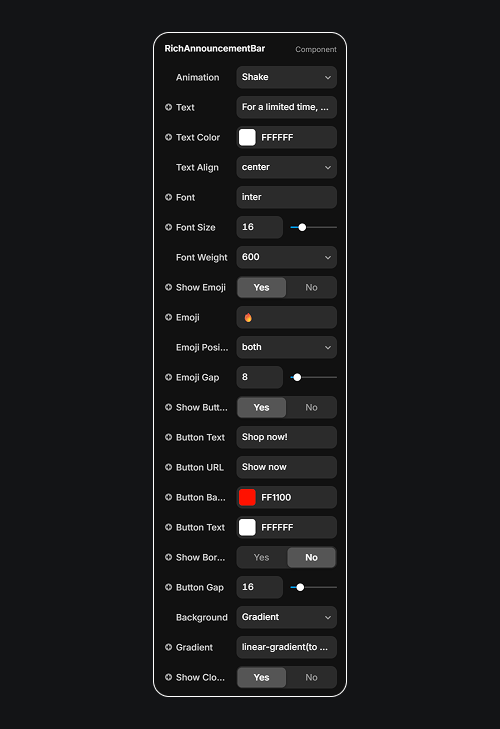 A flexible e-commerce announcement bar. Highlight offers, updates, and launches with animation, CTA, and full design control.