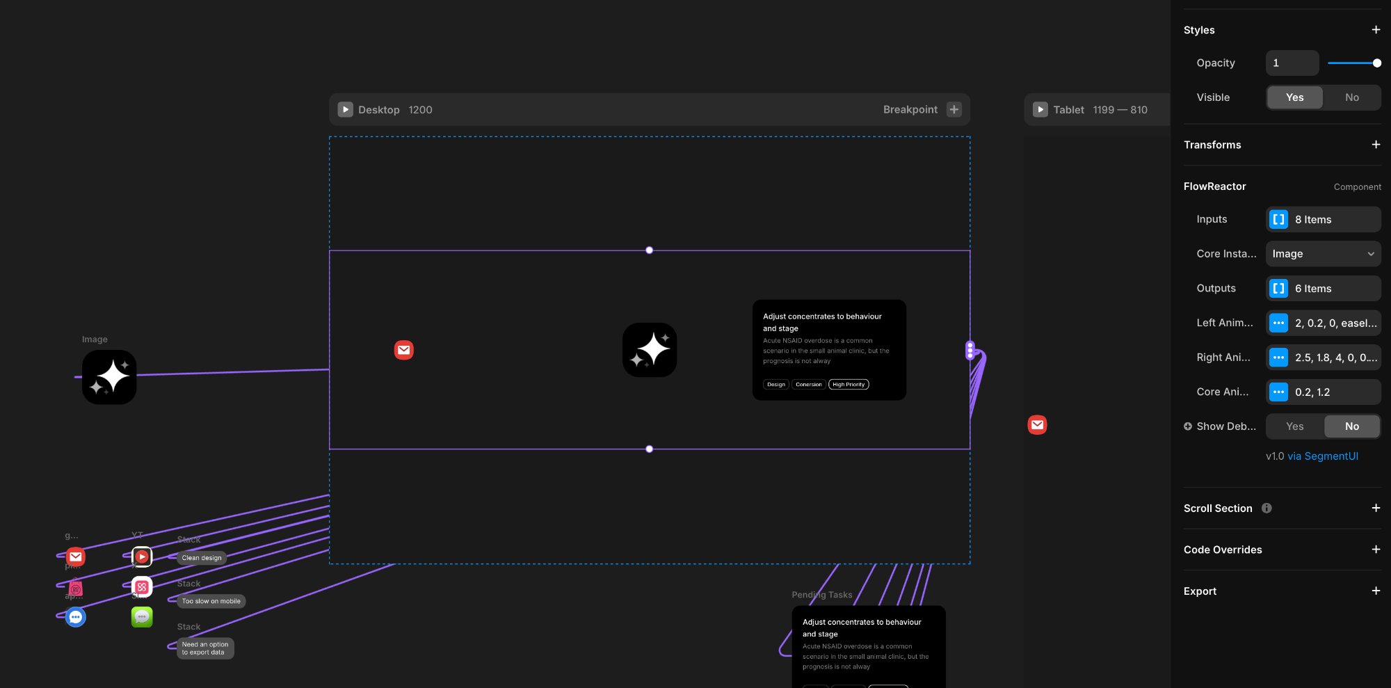 Each section has its own animation controls. Left Animation controls how input items travel (speed, timing between spawns, entrance/exit fading and scaling). Right Animation controls output items (speed, timing, how they appear). The Core Animation sets the pulse effect when outputs are emitted - this pop duration also controls how long output items take to fully appear, creating a synchronized effect. You can fine-tune easing curves, delays, opacity transitions, and scales to match your brand's feel.