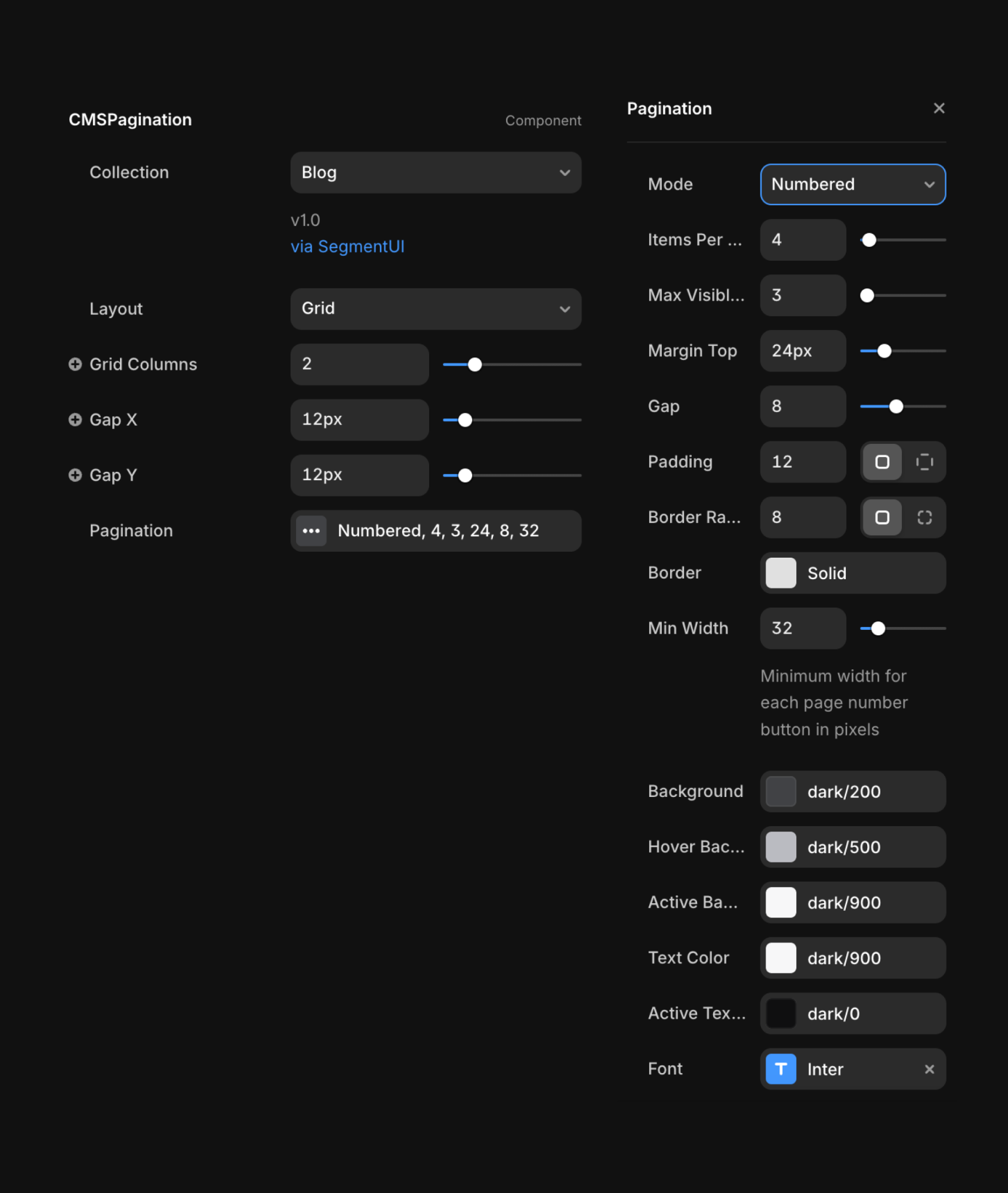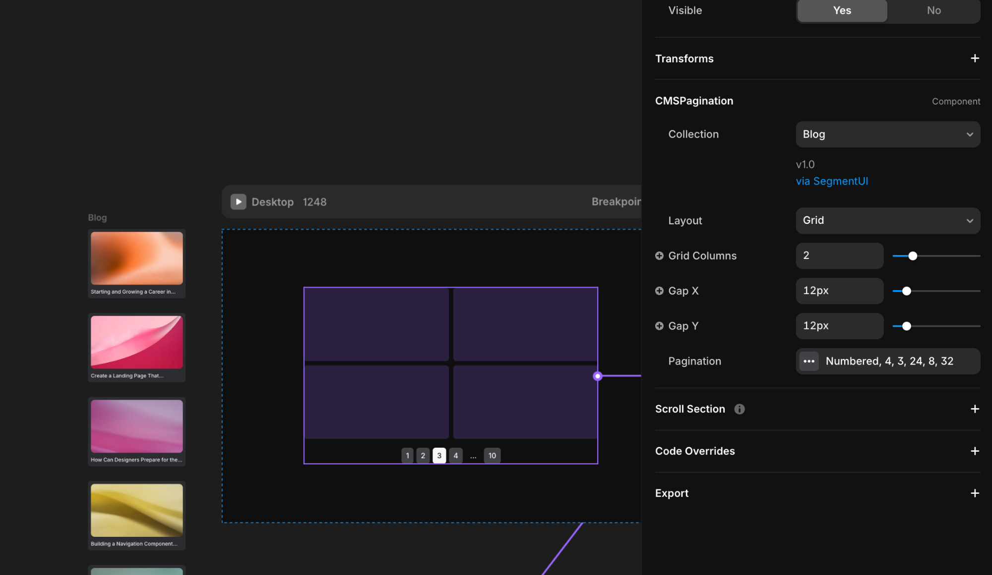 Connect your CMS collection to the Collection property control. Choose your preferred Layout (vertical, horizontal, or grid). For grid layouts, adjust Grid Columns to set the number of columns. Use Gap X and Gap Y to control spacing between items. In the Pagination section, select Mode (none or numbered), set Items Per Page, and customize the appearance of page numbers including colors, borders, padding, fonts, and hover states.