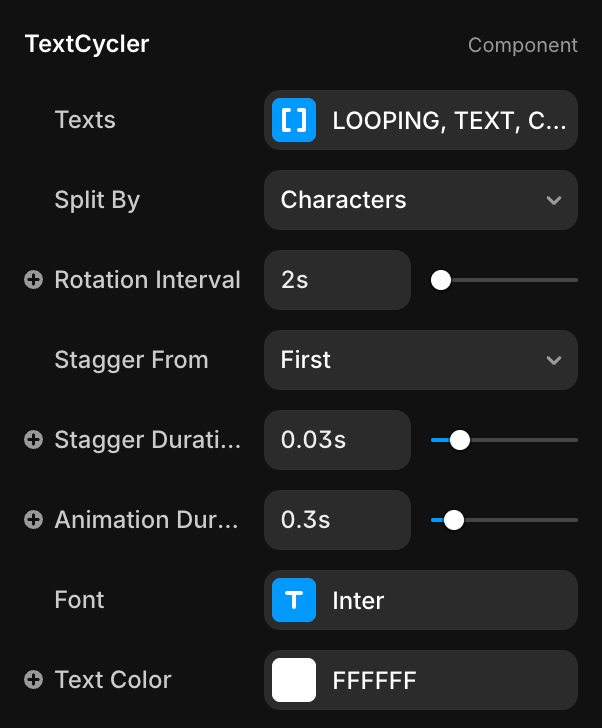 Text Cycler smoothly transitions between multiple text strings using character-, word-, or line-based animations for dynamic headlines and taglines.