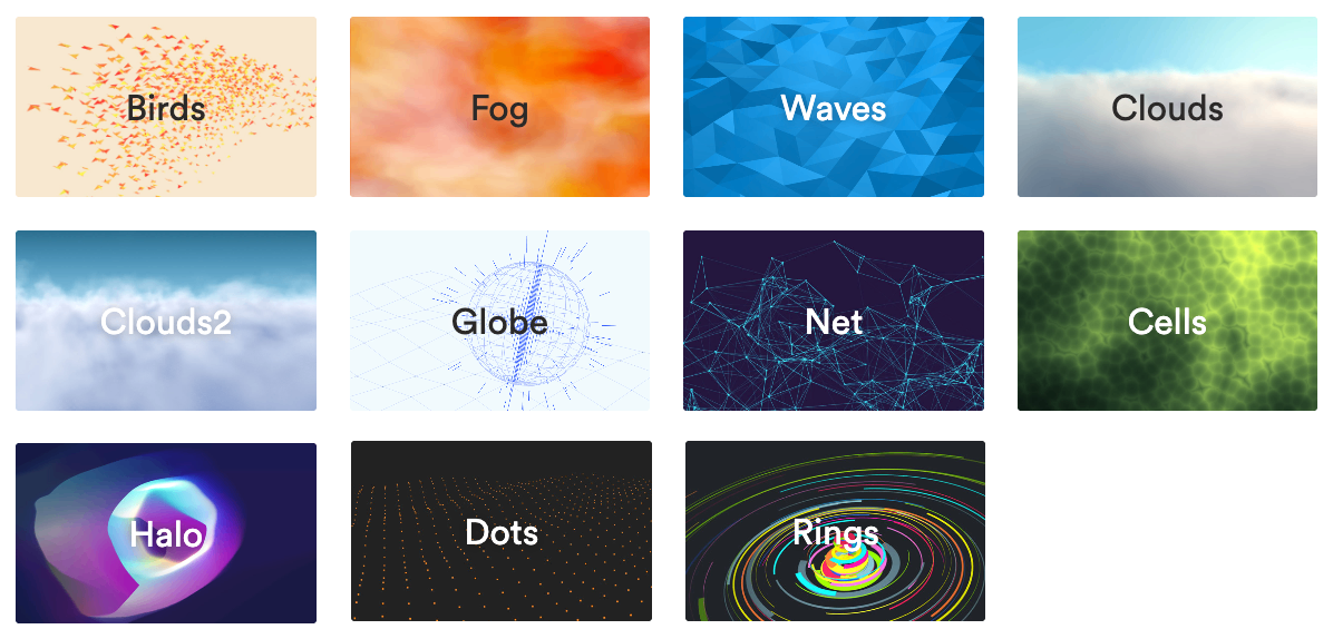Choose from Waves, Birds, Fog, Clouds, Net, Cells, Dots, Rings, Globe, and Halo — each with unique visual appeal.